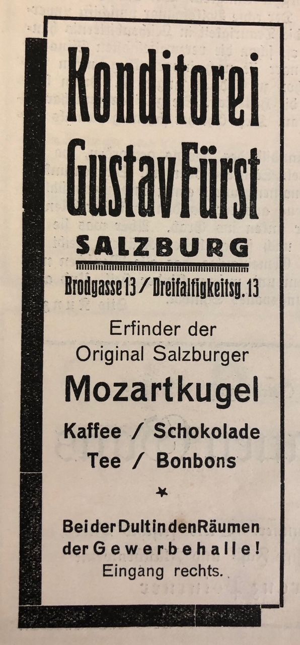 - eine Anzeige aus 1902 nach dem Umbau des Stammhauses "Erzeuger der Salzburger Spezialität Mozart-Kugeln" und